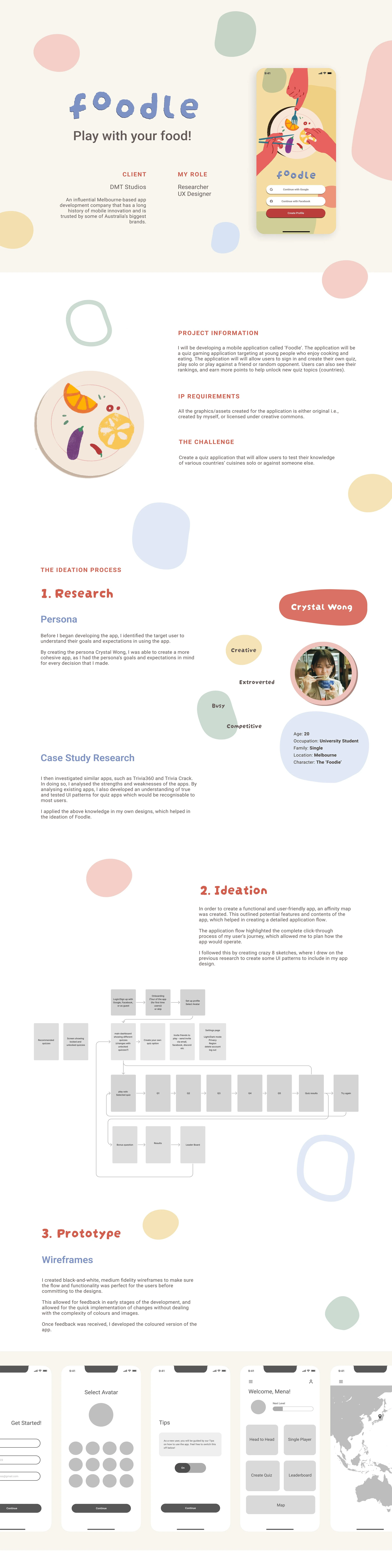 A food-based mobile quiz application. I created the assets in Procreate and Photoshop, and the prototype in Figma.